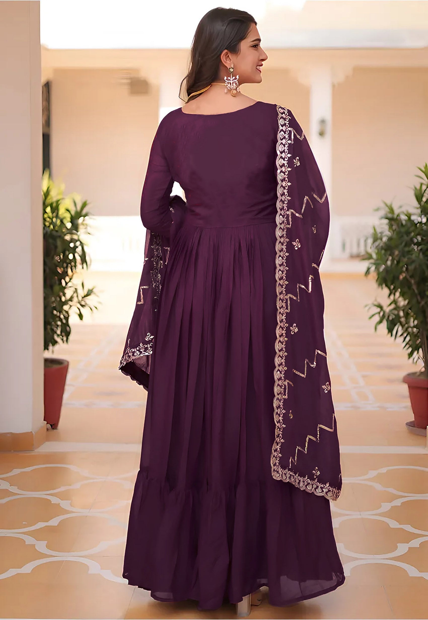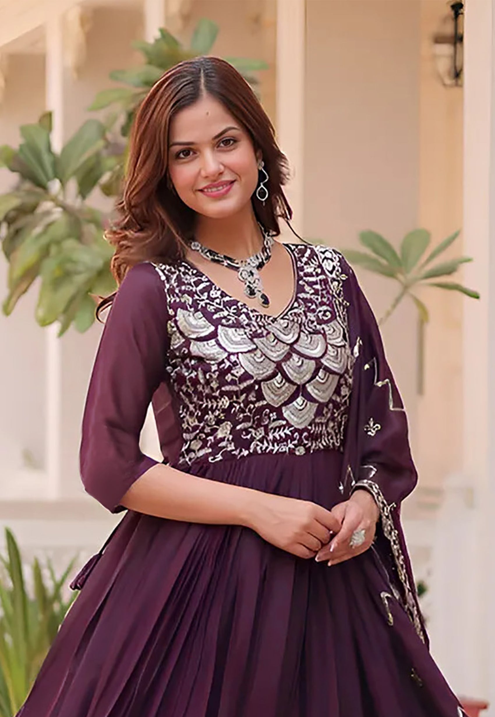 Command attention in this Black Anarkali ensemble, crafted from premium Georgette fabric. The top features delicate embroidery with a flowing 2.7-meter flair, creating a graceful and sophisticated silhouette. A full Row liningensures comfort, while full sleeves add elegance and refinement.