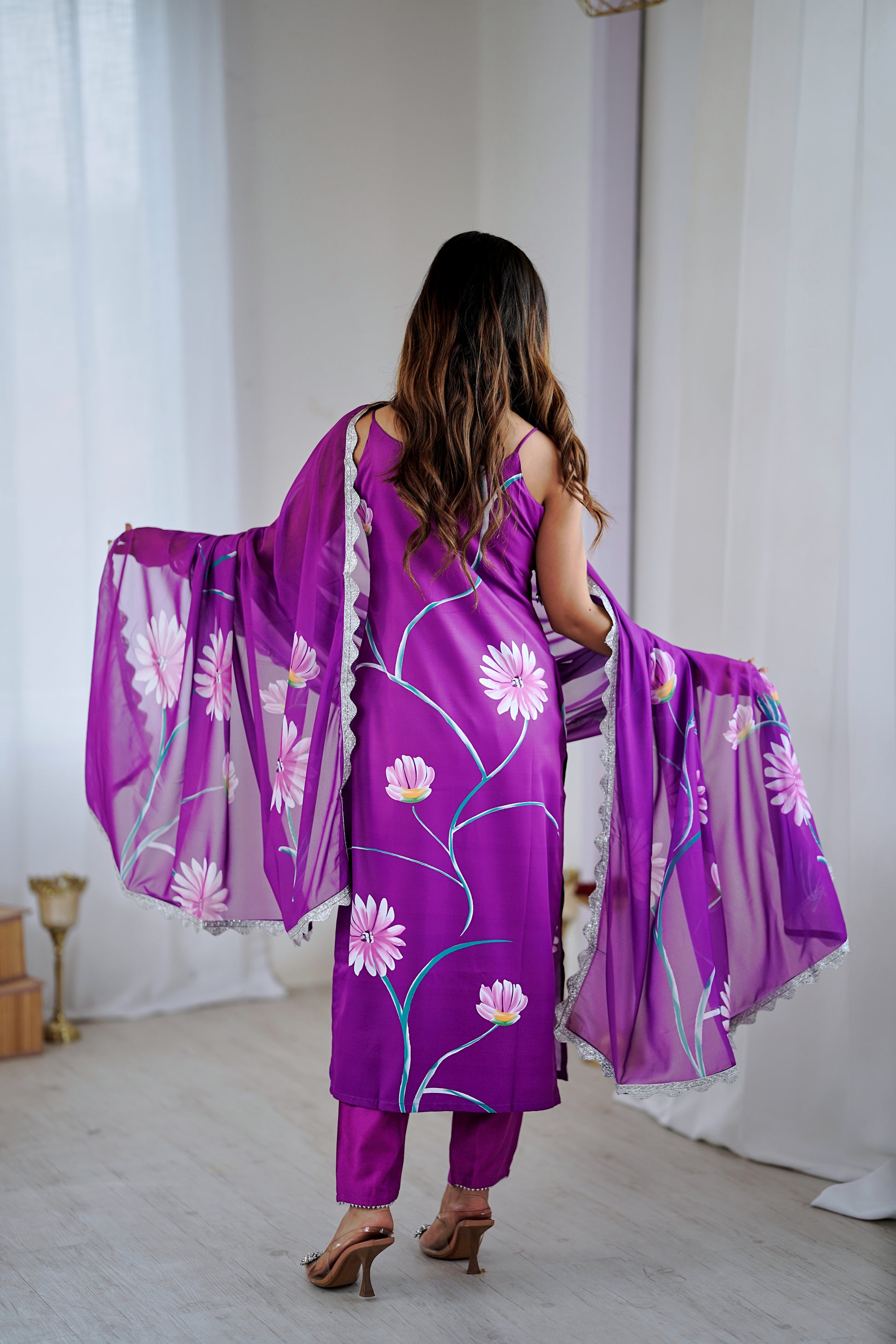 This sleek set features a Viscose French Crepe top and matching bottoms, both in a solid design for a clean, modern look. The ensemble is completed with a soft, flowing Georgette dupatta, adding a touch of elegance. Perfect for casual and semi-formal occasions.