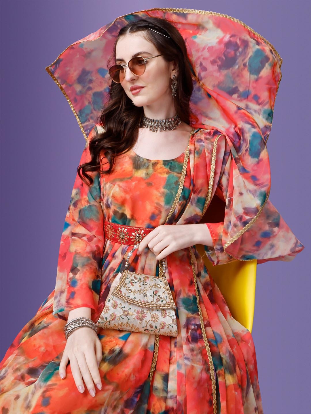 Step into vibrant elegance with this Multicolour Anarkali set crafted in premium Georgette fabric. The top features eye-catching printed patterns paired with a flowing 2.7-meter flair, creating a graceful and dynamic silhouette. A full Row lining ensures comfort, while the full sleeves add a refined finish.