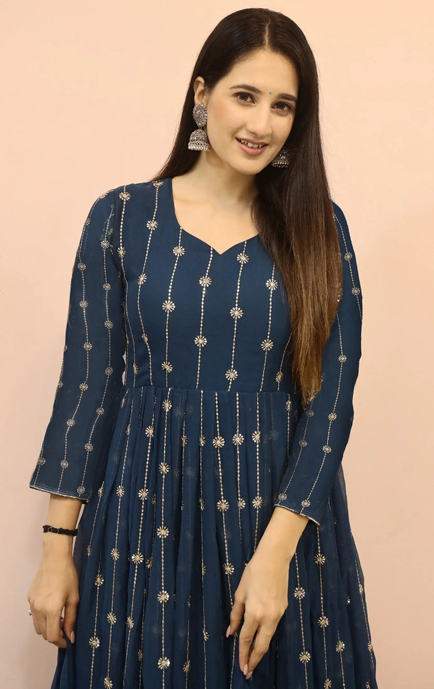 Elevate your ethnic collection with this blue Anarkali ensemble made from luxurious Georgette fabric. The top showcases intricate embroidery work paired with a generous 2.7-meter flair, giving it a rich and graceful fall. A full inner lining ensures comfort while the full sleeves add a touch of elegance.